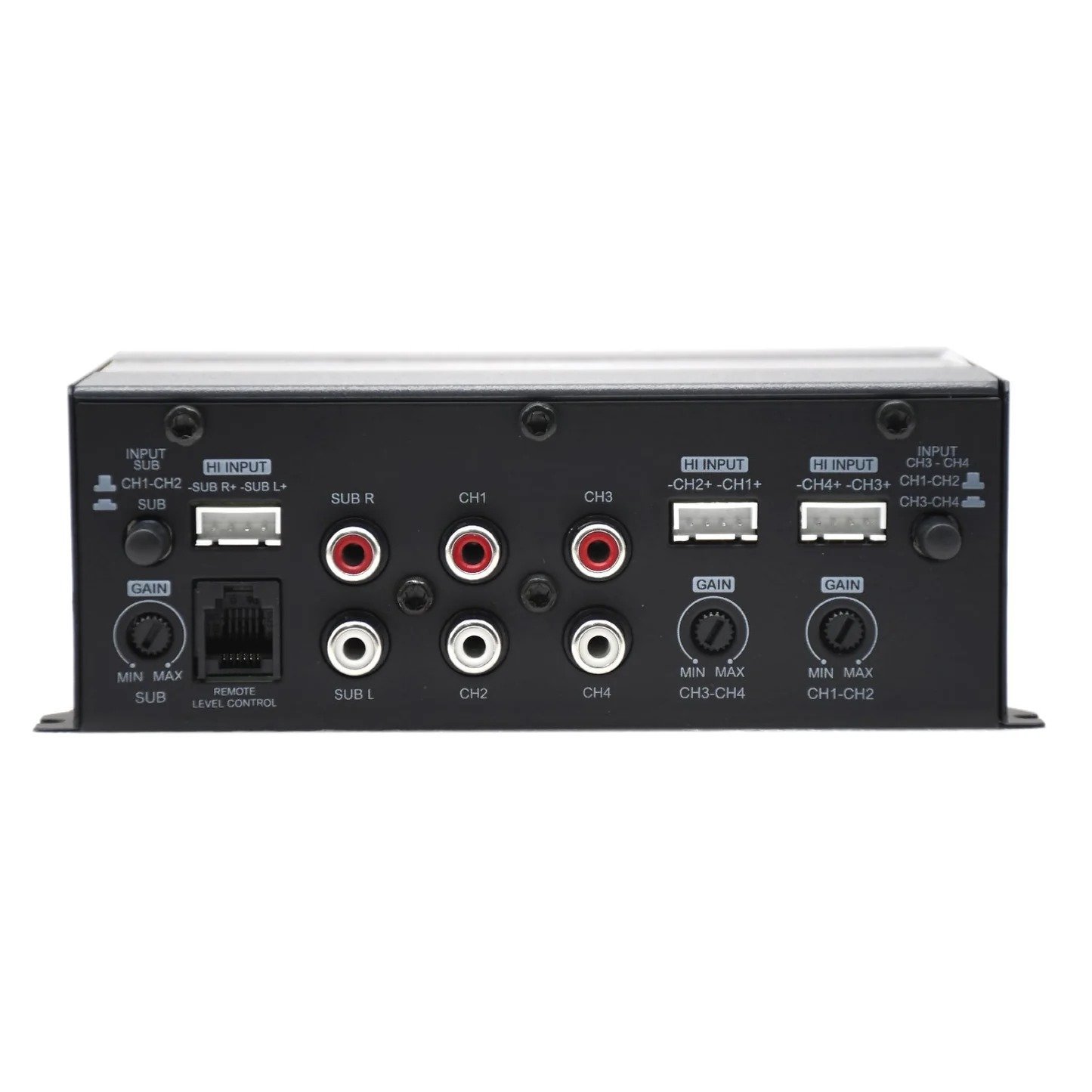| Frequency Response | 10 Hz – 20 kHz (CH1–4), 10 Hz – 250 Hz (SUB) |