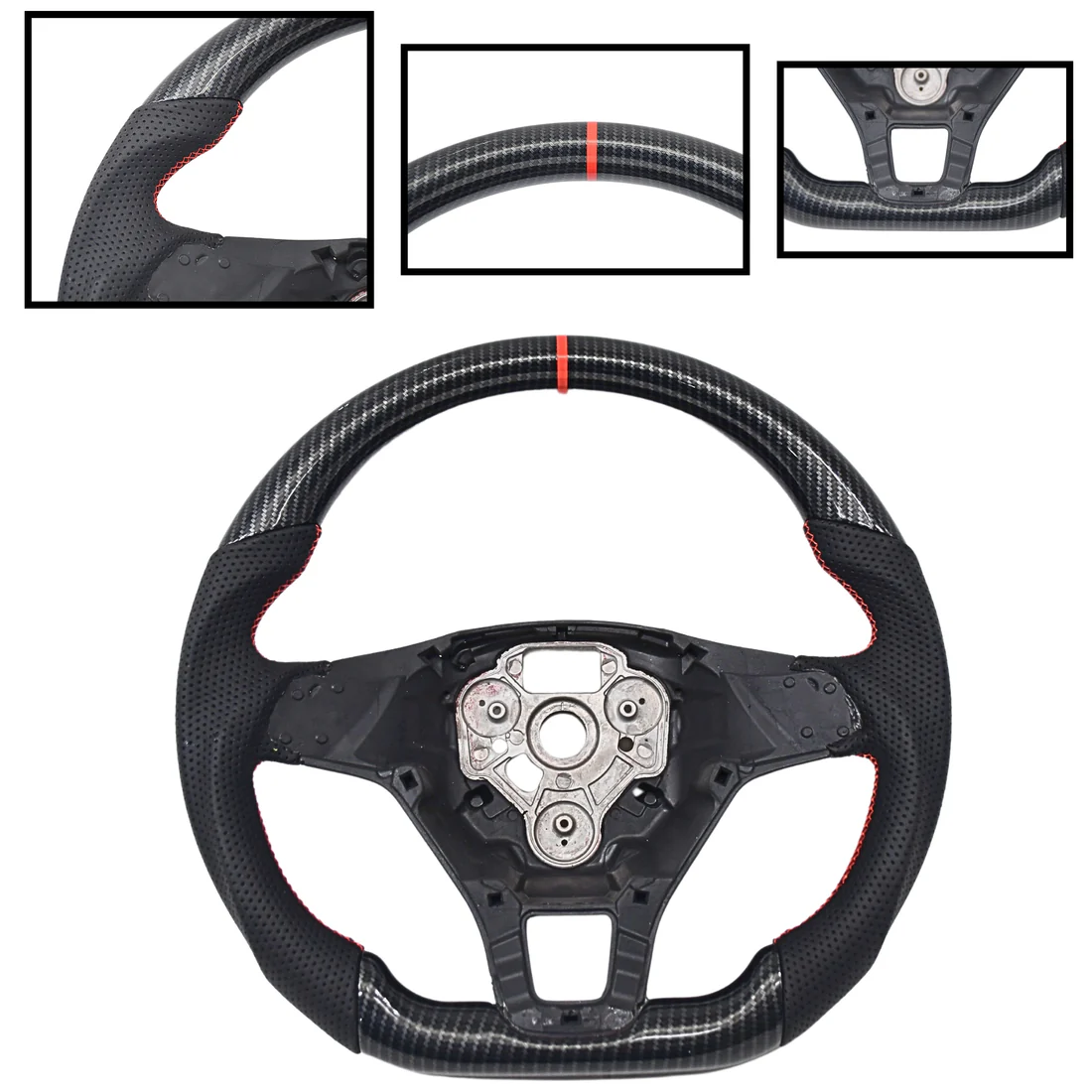 • Stylish copy carbon-finish steering wheel for VW Polo, Vento, and Ameo (2014–2023) • Flat-bottom sporty design enhances grip and interior aesthetics • ABS base with printed carbon finish offers durability and premium look • Compatible with OEM airbag and steering-mounted controls • Optional red top marker and colored stitching available (variant dependent) • Easy replacement with professional installation recommended